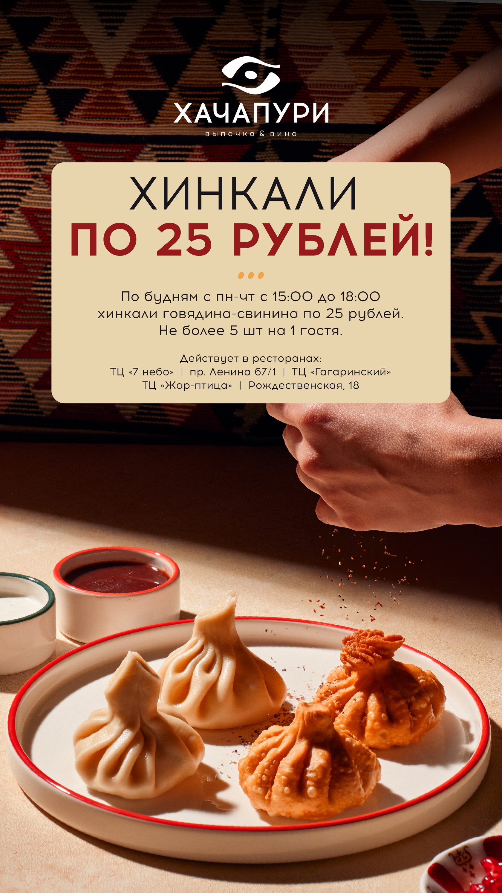 Вы можете заказать хинкали со свининой-говядиной за 25 рублей, не более 5 штук на одного гостя.